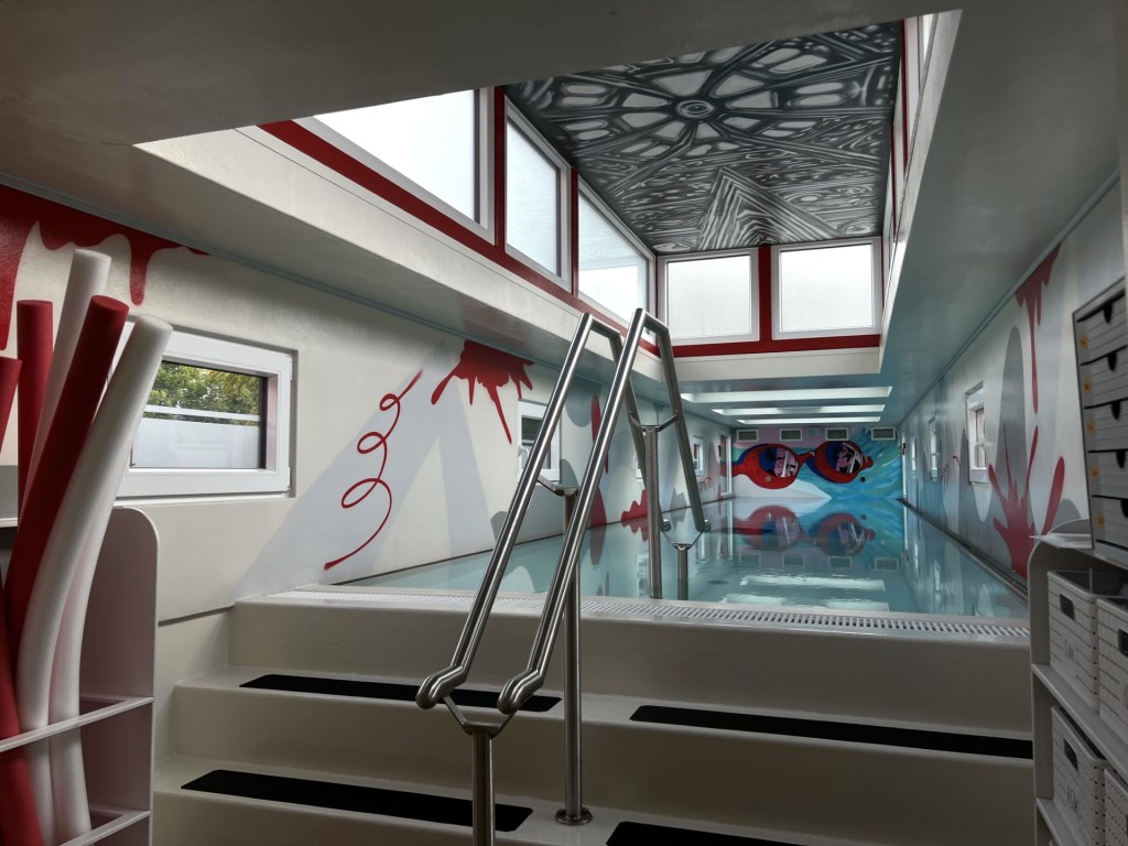 Die Mädchenumkleide wird zum gelben Salon, ein riesiger Wasserfleck prangt unter dem Sprungturm und Startblöcke kommen am Beckenrand miteinander ins Gespräch – hier geht es um Kunst im Bad!